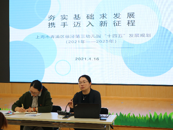 徐花副园长就《青浦区徐泾第三幼儿园“十四五”规划》进行阐述,让每一位成员都清晰地了解到幼儿园的规划和作为一名教师今后五年的发展规划。