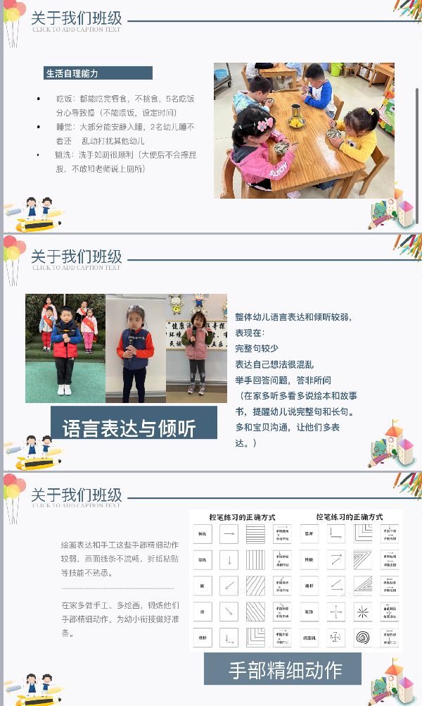 老师们将孩子们近阶段在一日生活中的情况图文并茂地展现给家长,一场场视觉盛宴下,家长也明晰了自己孩子幼儿园的成长和进步,以及需要努力的地方。