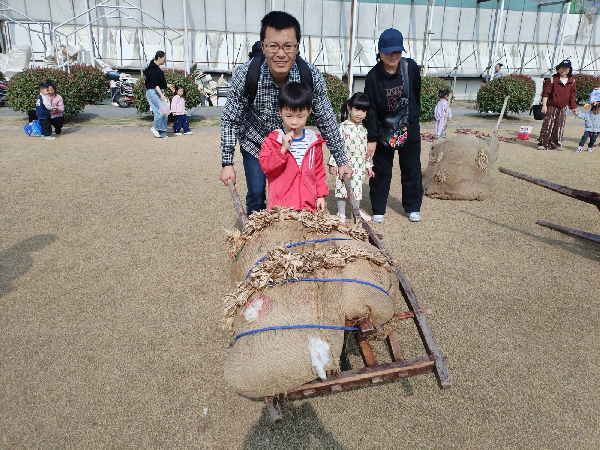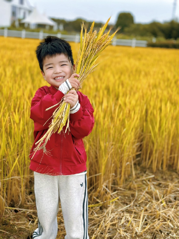 广阔的稻田瞬间变成了欢乐的游乐场。爸爸妈妈们和孩子们俯身体验收割,孩子们有模有样地学习打稻谷,构成了秋日最美的画面。