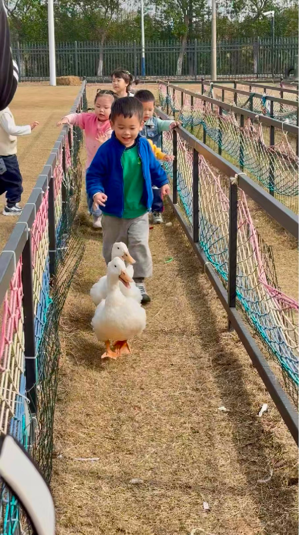 最让宝贝们期待的,是与小动物的温柔互动。他们拿着专用饲料,小心翼翼地递到小羊嘴边,看着小羊低头进食,笑得眼睛眯成了一条缝;对着湖面的天鹅挥挥手,轻声喊“天鹅你好呀”;还模仿鹦鹉的叫声,引得小鸟扑棱着翅膀回应,清脆的鸟鸣和宝贝们的笑声交织在一起,满是对小动物的喜爱与友善。