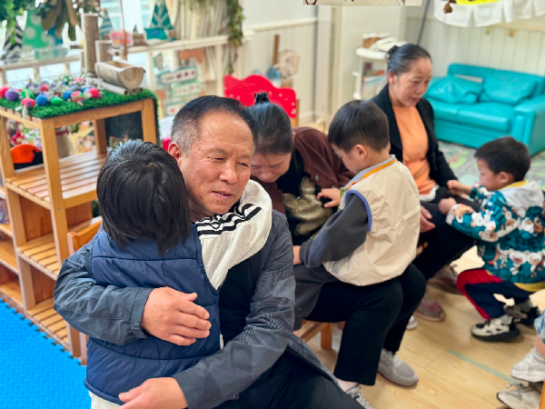 小 4 班以歌声传情,“爷爷亲奶奶亲”“我爱爷爷奶奶”等儿歌响起时,孩子或坐祖辈膝头、或依偎怀中,跟着节奏摇晃,唱到动情处还会亲吻祖辈脸颊,祖辈们感动落泪。