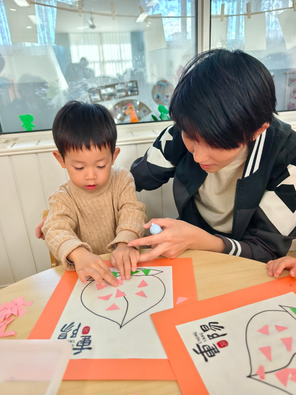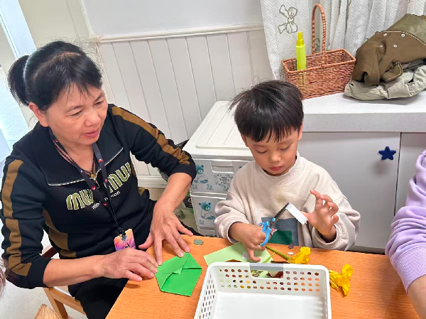 托 1 班 “重阳福寿桃” 活动,孩子在祖辈帮助下,用彩笔、亮片装饰纸质寿桃,甜甜说着 “祝爷爷奶奶福寿安康”;托 2 班 “给爷爷奶奶做造型” 活动,孩子撕彩纸贴在卡纸头像上,为祖辈设计 “卷发”“发饰”,逗得祖辈笑不合拢嘴,纷纷拍照留念。