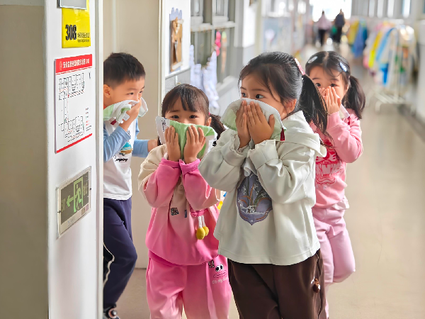随着消防警报拉响,全园进入应急状态。各班立即停止手头的活动,教师们组织幼儿用湿毛巾捂住口鼻、低头弯腰,沿既定路线快速撤离。楼梯口、转角处均有提前驻守的行政人员指挥疏导,防止拥堵。