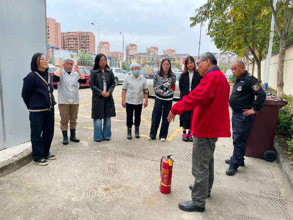 与此同时,行政、保安和营养员参加灭火演练,熟练操作灭火器将火情控制住。