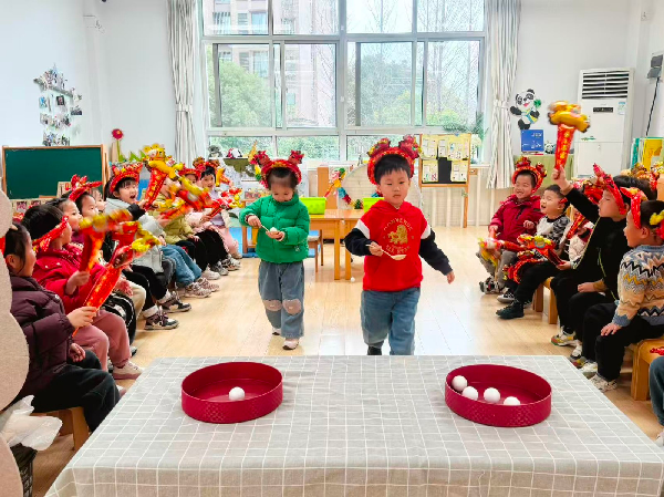 托班的萌娃们迎来了趣味十足的“捞元宵”游戏。圆圆的“元宵”“漂浮”锅里,像一颗颗晶莹的小皮球。孩子们化身“小小捞月手”,拿起捞铲,小心翼翼地捞起“元宵”。从最初的手忙脚乱到渐渐掌握技巧,每捞起一颗,孩子们的小脸上就绽放出灿烂的笑容。这个充满童趣的游戏,不仅锻炼了托班幼儿的手眼协调能力,更让他们在轻松愉快的氛围中,初识了元宵节的传统元素。